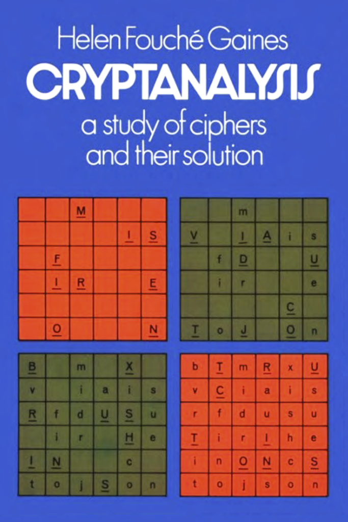One of my own favourite introductions to classical cryptography is Helen Gaines’ “Cryptanalysis”, which is now out of copyright, and you can download a copy here.